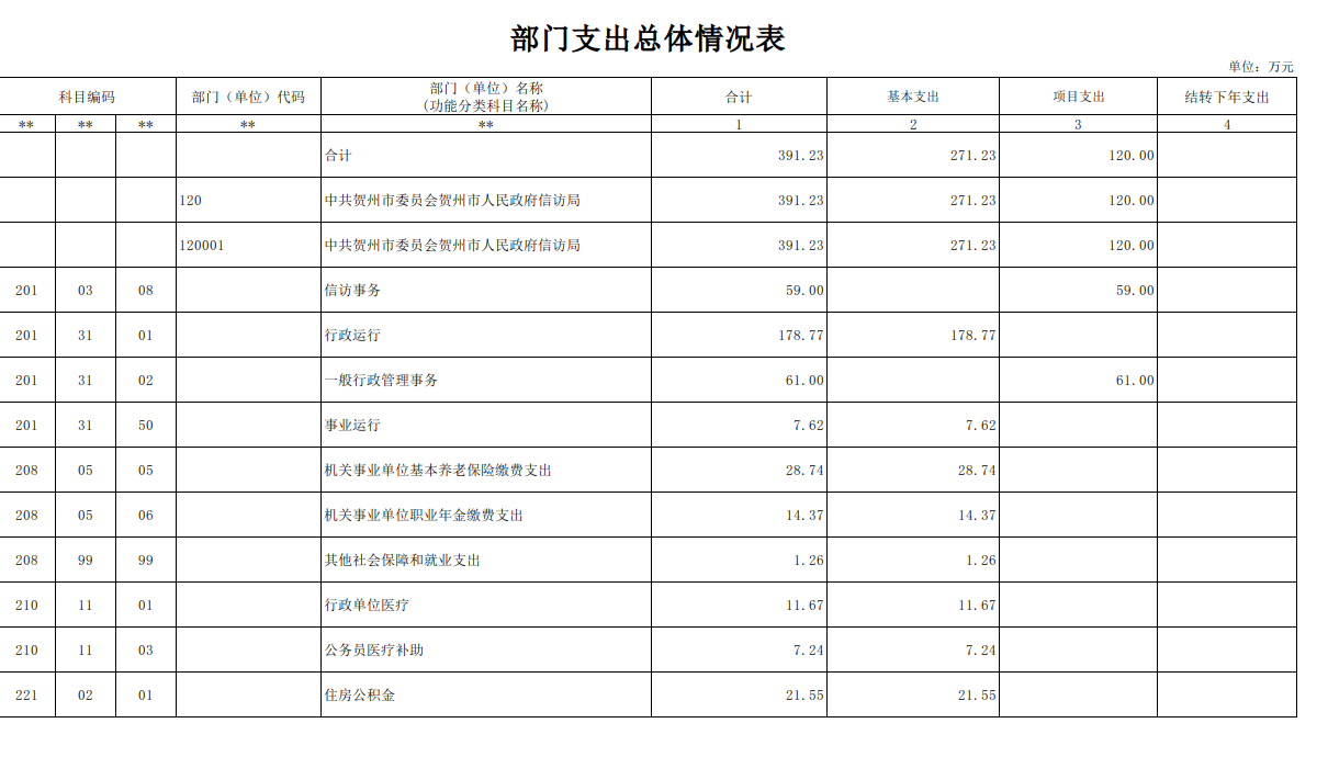 (一)贺州市信访局。行政编制11人,聘用人员控制数0人,财政供给单位编制内实有人员17人,其中行政编制在职人员11人,离退休人员6人(其中享受离休待遇0人)。编外在职实有人数0人。