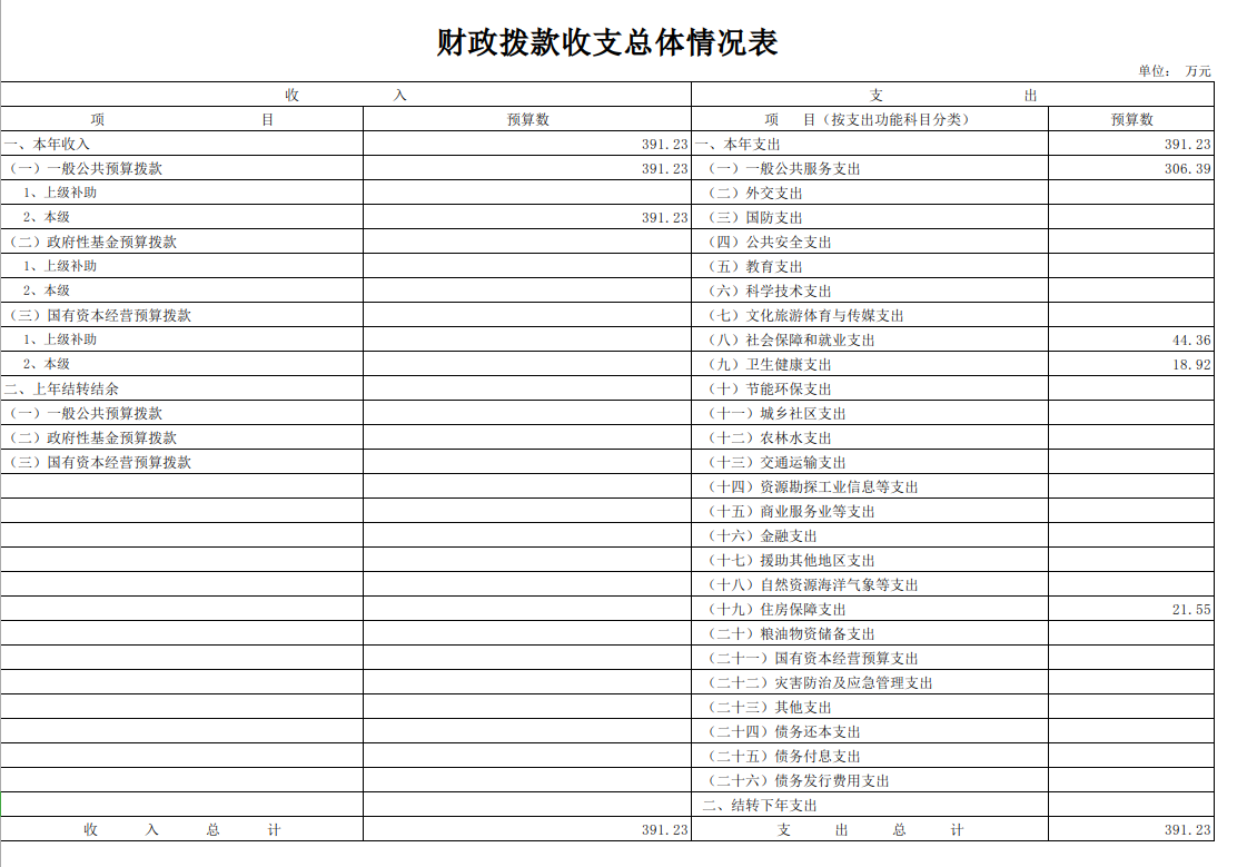 2022年部门预算总收入391.23万元,同比(增加)13.44万元,(增长)3.56%,其中: