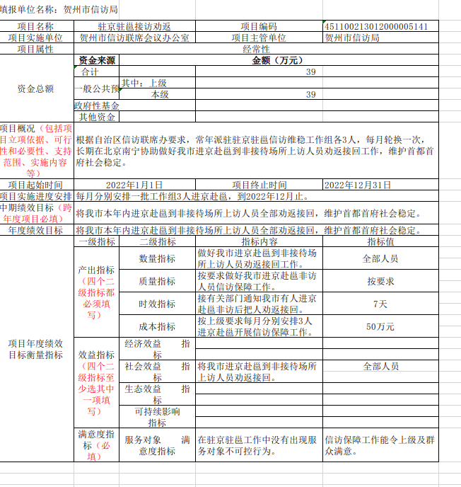 2.驻京驻邕接访劝返项目39万元。主要用于按要求每月派驻北京南宁维稳工作人员住宿费开支25万元;伙食费及市内交通费补助14万元。