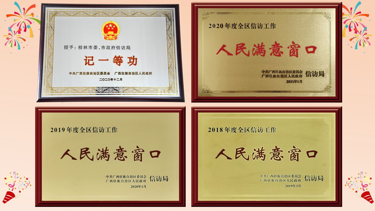 2018年,自治区信访局开始开展创建“人民满意窗口”活动,在全区14个地级市中,成绩前四名才能被评为“人民满意窗口”单位。桂林市群众信访服务中心不惧挑战,勇立排头,2021年综合评比再次以全区总分第一名的成绩,被自治区信访局评为“人民满意窗口”的单位,这也是2018年至2021年全区唯一一个连续四年被自治区信访局评为“人民满意窗口”的单位。