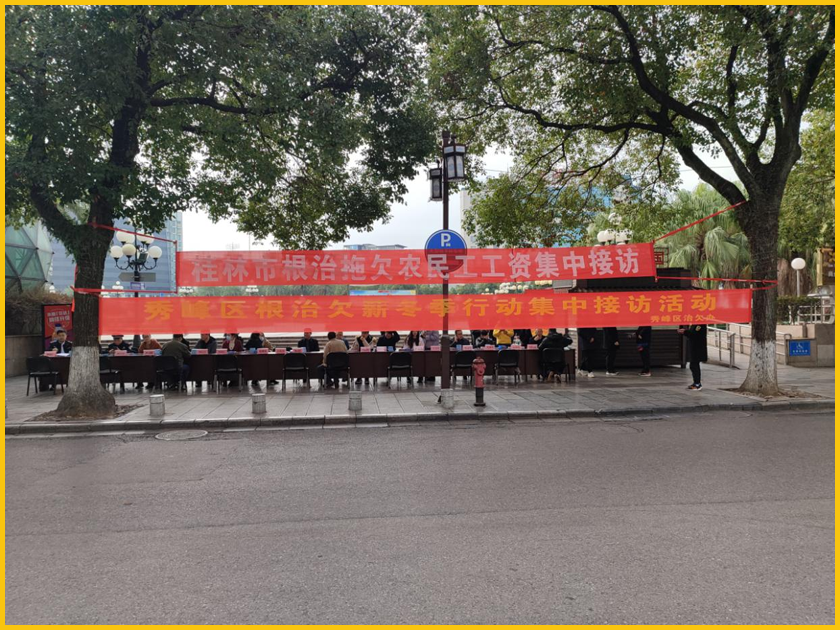 为切实维护农民工的合法劳动权益,防范化解重大欠薪风险隐患,根据自治区统一部署,我市于2023年12月5日上午在桂林市中心广场开展根治欠薪联合集中接访活动,现场接待农民工欠薪投诉举报。